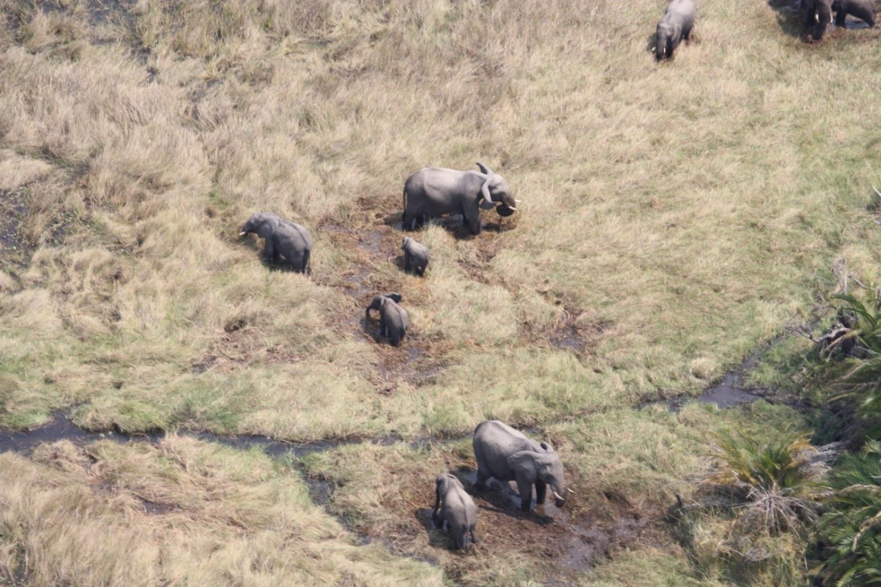 The “fan” of the Okavango Delta starts to make it’s appearance, with sporadic bits of water, and as we head North, we see more and more water, till it is almost one big lake with some tree-filled islands. The water-ways also become clearer, and we start to see some elephant herds. Jenks is keeping us in sight, and takes appropriate avoiding action when we call for an orbit over a particularly good elephant sighting to get some camera shots.
