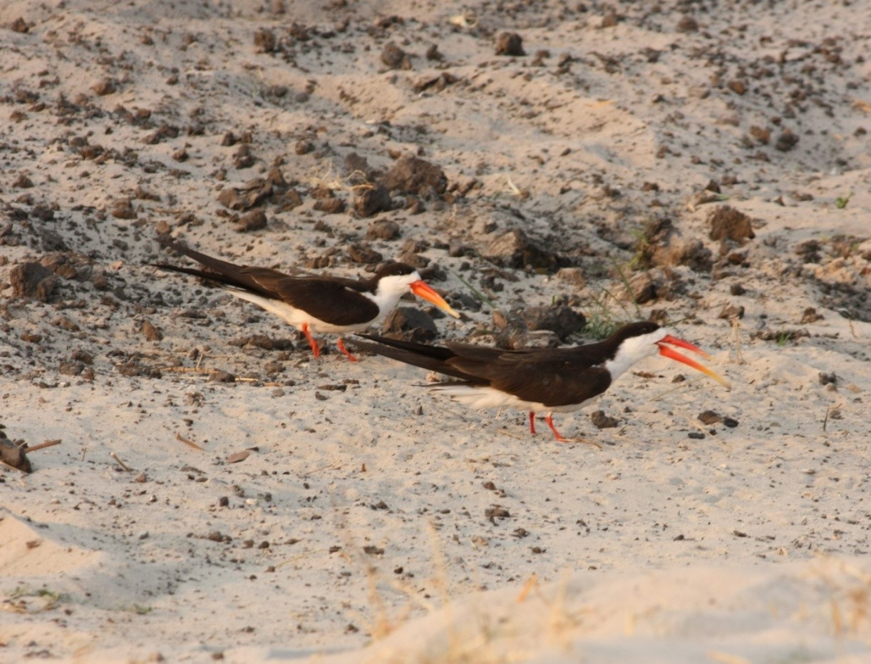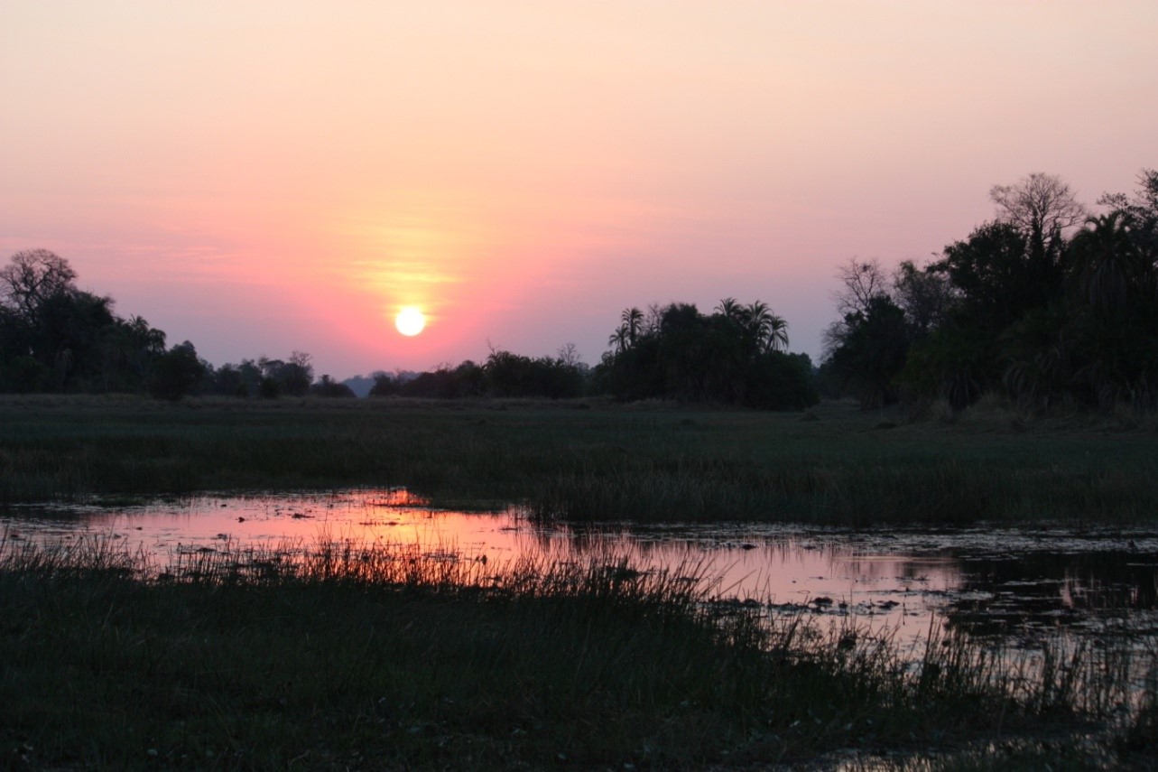 Obligatory beer in hand...........  Our polers beach us on an island, where we sip sundowners, taking in stunning birdlife and action too numerous to note here. Some firsts for me : 1) the Giant (black in colour) Kingfisher, catching his dinner in front of us, 2) the multi-coloured Malachite, also catching his tit-bit then settling on a branch not 10 feet away from us. We watch and photograph the hapless bait-fish being stunned and eventually killed over a period of about 10 minutes with 5 -15 second intervals between each slap against the tree branch. 3) the African skimmer, leaving a surgical line behind him, lower beak in the water as he collects his food on the glass-smooth water surface with the sunset now gone – magical............