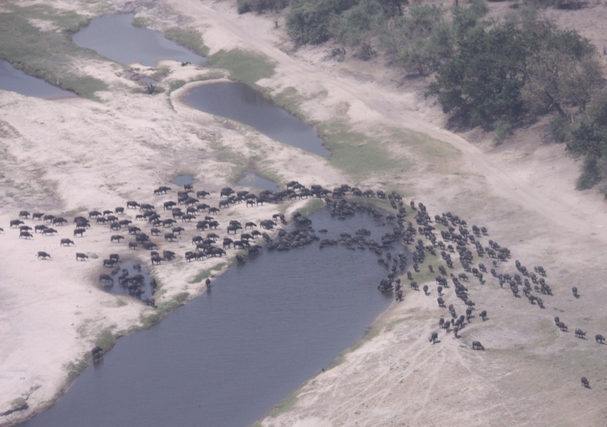 The Chobe river yields plenty Elephant, some African water buffalo, varied birdlife, but little else. It is extremely dry, and a Winter fire has left the terrain barren and devoid of any grazing, hence the lack of other wildlife. As we fly over the Linyanti floodplain, the promised Hippo keep hidden, and my credibility comes into question! The only sign of them is their footpaths, as well as an unfortunate dead hippo, upturned with his 4 feet sticking skywards. I get a ‘photo of this rather grotesque sight with Russell’s camera. The endless elephant provide for some unique pictures, and I see the largest herd of Buffalo I have ever seen!