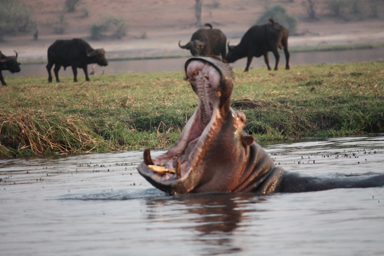For the afternoon boat cruise, we have substituted the big commercial boat with our own private flat-bottomed speedboat. This will get us closer to the shores, nearer game, and be able to go where the draft of the big boat will prevent it going in shallower waters. Also, we are not subject to the inane babble of others....... This time, we make sure the cooler-box is properly stocked, and then we skim across the choppy water into the National Park, passing Sedudu Island, which Namibia claimed as theirs about 20 years ago. The dispute very nearly resulted in the 2 countries going to war over this useless (mostly flooded) 5-square km island, but sanity prevailed and they agreed to abide by whatever the International Court of Justice decided, which in 1999, ruled in favour of Botswana. Ever since, the Botswana flag flies from an awkwardly leaning pole planted on the island, almost in  gesture similar to one’s middle finger to Namibia!