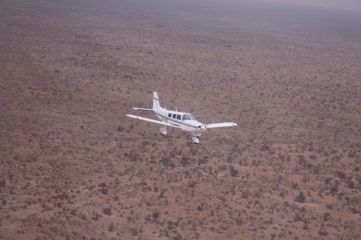 The sole purpose of our visit to Gaborone airport is to do the customs and immigration formalities into Botswana. This does not take too long, and after landing fees are paid, we enjoy coffee, tea, and muffins while we wait for Andy’s friend to visit. Due to a time-zone confusion, this plan does not come to fruition, and soon we are mounting our trusty steeds for the somewhat boring and long flight to our destination, Haina Ventures, set in the hot and arid Kalahari Desert. We form up in a loose formation again, and remain dead on track as is required by law, bearing in mind the hostile terrain below us. Once clear of controlled airspace, we nudge down our aircraft, and the low-level flight releases us from what would otherwise be rather boring flying. The visibility is rather poor, and worsens as we approach our destination. We are thankful that we have GPS to assist us locating our destination airfield cut out of the desert bush. The panorama en-route does not look like a normal desert – the landscape is covered by trees, shrubs and grass, however, the thick, khaki-coloured sand is waiting to trap the unwary. Only the hardiest of 4x4 vehicles will traverse this terrain, and even then, not without incessantly getting stuck. As we drone on, there is no sign of life, human or animal..............