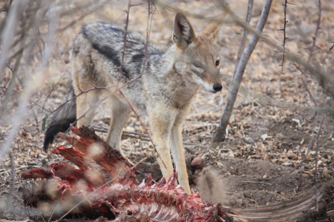 Mozilla & Adriaan deliver us respectively to our luxurious tents set upon wooden floorboards, and the plan is to meet in about 30 min for “high tea” and a shortened game drive. High tea turns out to be more like “high beer”, nevertheless the tasty treats that go together with that are welcome. There is a buzz of excitement as Adriaan returns to the Lodge to say that he has sighted a pride of lions who have just finished gorging themselves on a Kudu. We make our way to the Land Rover and soon we are off the beaten track in search of the lions. Mozilla winds his way over and around bush, doing his best to avoid his passengers getting scratched by some thorny branches.  The waiting vultures in the treetops give us a good idea of what direction we should be travelling in. After about 15 min, we pass the skeletal remains of a once-proud Kudu, and soon after, chance upon the Pride - two adult females, three middle-aged youngsters, and three one-year old pups (so cute!). Initial interest in our arrival is soon overtaken by the need to rest and digest their meal, and as they flop over, their distended stomachs pointing skywards look completely unnatural. We get the odd hairy eyeball from some of the Lions, otherwise they seem completely oblivious to our presence. Cameras snap away, and videos roll – rightfully so – it is a wonderful sighting! After about half an hour, with the sun beginning to set, we make our way back to the main road. As we pass the carcass, one of the group point out a Black-backed Jackal scavenging on the remains of the Kudu. This turns out to be another special experience, as most of us have never seen such animal behaviour. The jackal is very nervous and keeps running out to see if the Lions are approaching, rushing back in, snatching some scraps. Fascinating, and with the sun now gone Mozilla delivers as to a nearby water-hole, where we are treated to tasty snacks and sun-downer drinks. Great camaraderie flows, and the banter is non-stop. Poor Jules is snapped passing water behind a giant ant-heap – I wonder if she managed to erase that rather unflattering photo from Jenks’s camera..........