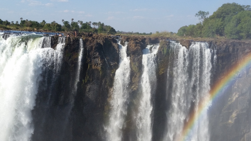Discretion being the better part of valour, I divorce myself from these adult hooligans who try and coerce me into “white-water river rafting” with them. Watching the video and photos on a big screen that evening over pizza and beer at “Shoestring backpackers”, I am happy to say I think I made the right decision........ Whilst they loved it, it did hold its moments of terror, being tipped out into the raging waters twice, and the fact that they came away unscathed, I presume is what made it fun – dicing with death!  The afternoon is spent exploring the Victoria Falls, one the 7 natural wonders of the world, now also a UNESCO World Heritage site. While the water-flow is slow now, It averages one BILLION litres per SECOND –hard to get your head around! When at its peak during the months of Feb – May, it has the biggest sheet of water in the world, at 1708 m wide, and dropping 108 m (350’) into the gorge below. There is too much information to put here – Google for more interesting data.